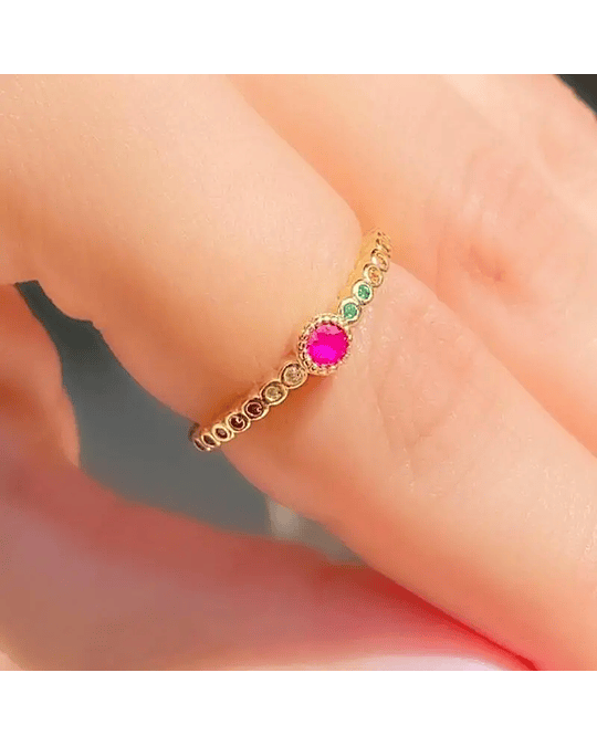 - Design: Este anel apresenta um design encantador com zircônias multicoloridas (Rainbow) cravejadas ao longo da banda, criando um efeito deslumbrante de arco-íris. No centro, uma pedra maior destaca-se, adicionando um toque de glamour e elegância.