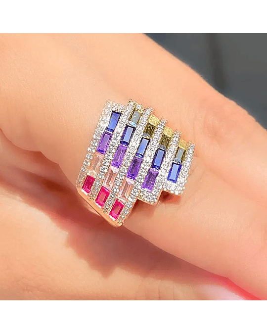 Anel em Zircônias Navetes Colors e Zircônias Cristais em Detalhes no Meio