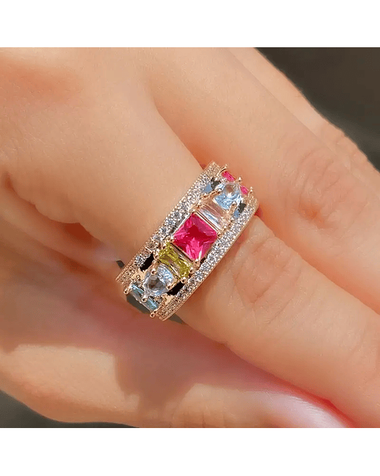 Cravação: As zircônias de alta qualidade são meticulosamente cravejadas ao longo do anel, proporcionando um brilho intenso e duradouro. Cada pedra, tanto colorida quanto cristal, é cuidadosamente posicionada para maximizar seu efeito cintilante e garantir um visual deslumbrante.Materiais: Fabricado com materiais premium, este anel garante durabilidade e um acabamento impecável. O design cuidadoso assegura que cada detalhe das zircônias navete seja perfeitamente definido, mantendo o charme e a elegância da peça ao longo do tempo.