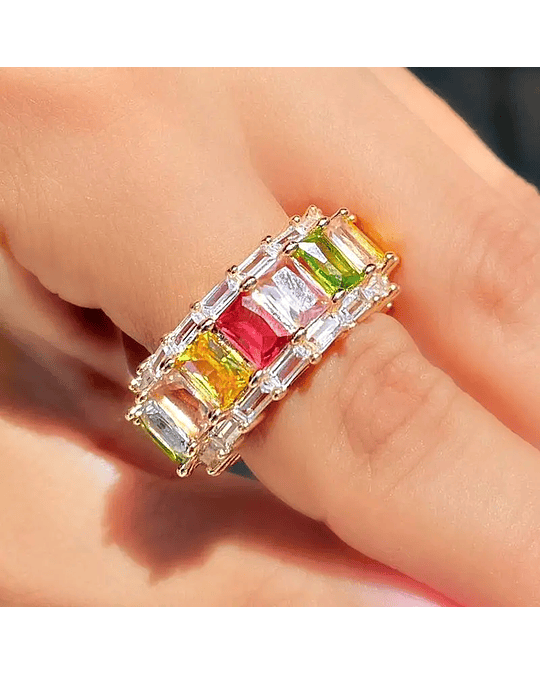 Cravação: As zircônias de alta qualidade são meticulosamente cravejadas ao longo do anel, proporcionando um brilho intenso e duradouro. Cada pedra, tanto colorida quanto cristalina, é cuidadosamente posicionada para maximizar seu efeito cintilante e garantir um visual deslumbrante.Materiais: Fabricado com materiais premium, este anel garante durabilidade e um acabamento impecável. O design cuidadoso assegura que cada detalhe das zircônias navete seja perfeitamente definido, mantendo o charme e a elegância da peça ao longo do tempo.