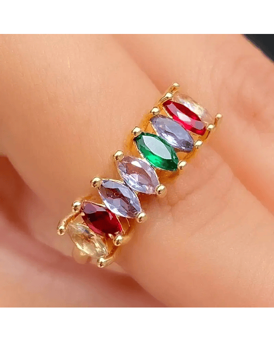 Este anel apresenta um design encantador com zircônias navete, conhecidas por suas facetas alongadas que refletem a luz de maneira espetacular. O design elegante e sofisticado das zircônias navete cria um visual marcante e glamouroso.