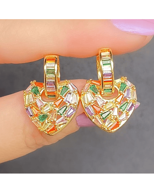 - Design Elegante: Brinco argolinha com pingente em formato de coração, detalhado com zircônias navetes coloridas que proporcionam um brilho sofisticado e alegre.