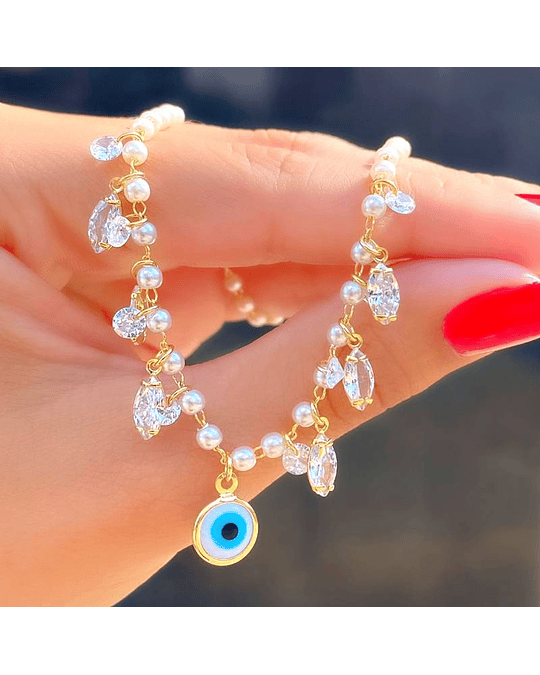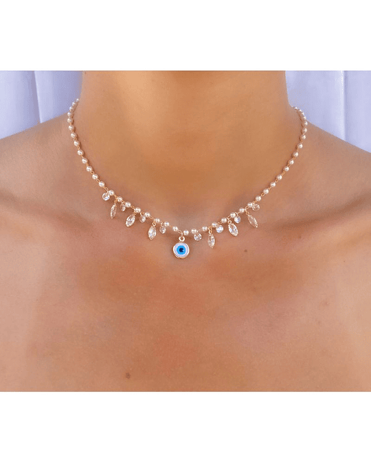 Este colar apresenta uma corrente delicada em pérolas, proporcionando uma aparência elegante e sofisticada. O destaque deste colar é o pingente de olho grego, um símbolo de proteção e sorte, que adiciona um toque de significado e estilo à peça.