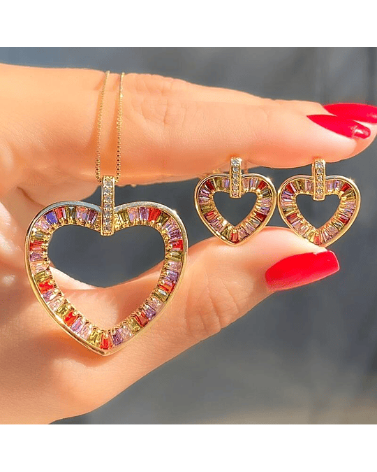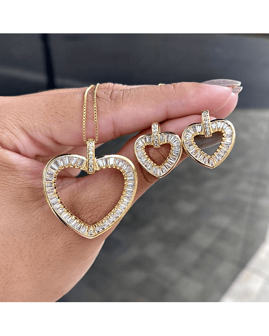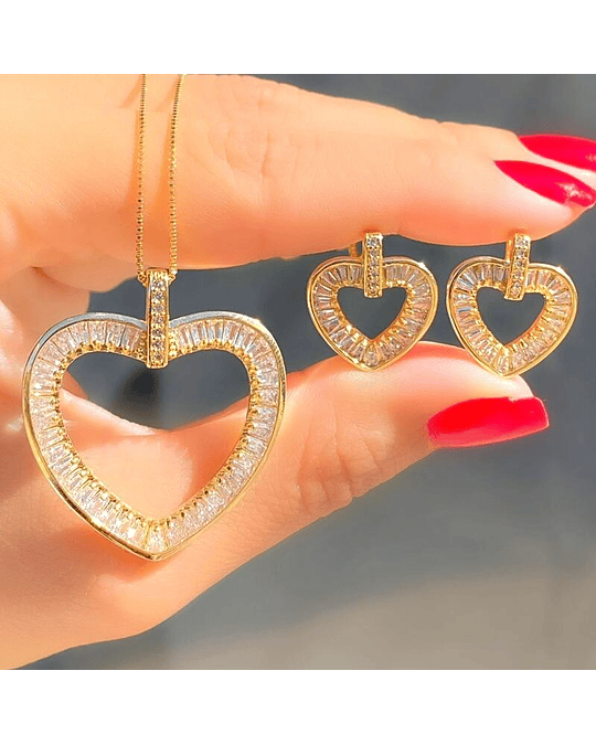 Realce sua elegância com o deslumbrante Conjunto Colar e Brinco de Coração Cravejados em Zircônias.