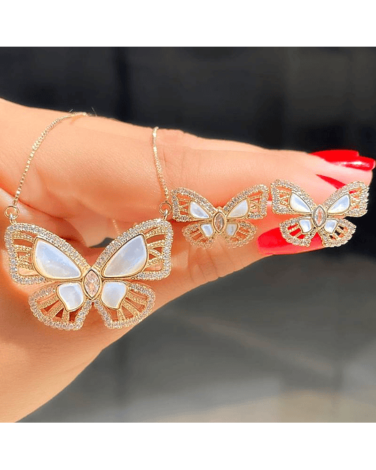 Este sofisticado conjunto com pingente de borboletas é cravejado em micro zircônias e possui detalhes em madrepérola, ideal para quem busca elegância e delicadeza.