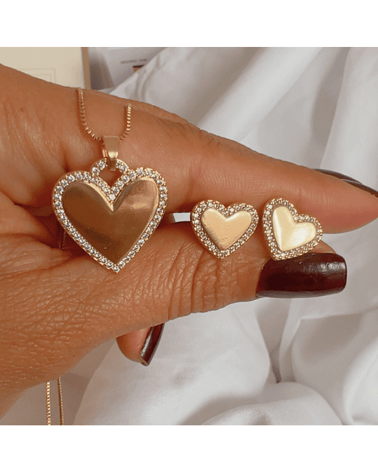 Conjunto de Brincos e Colar com Formato de Coração Cravejado em Zircónia