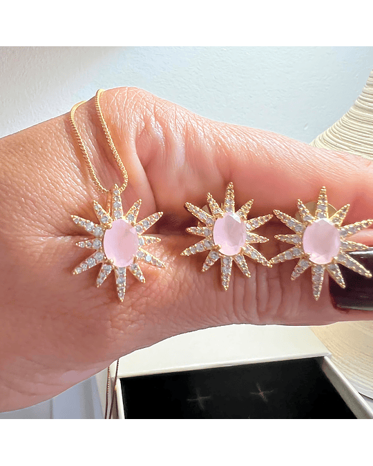 O colar apresenta um pendente em formato de sol com uma pedra rosa oval no centro e raios cravejados de zircónias, complementado por uma corrente fina e um fecho seguro. Os brincos seguem o mesmo design harmonioso, com fecho tipo borboleta para segurança e praticidade.