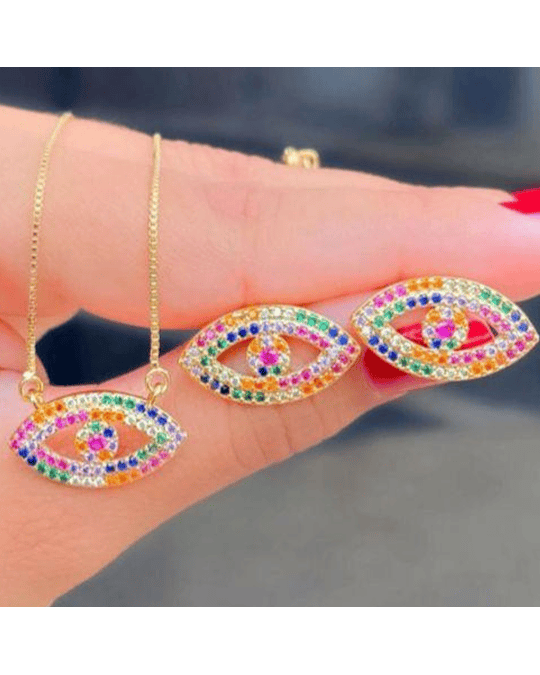 Este conjunto de colar e brincos em formato de olho grego é banhado a ouro 18k e cravejado com zircônias coloridas, oferecendo um toque de elegância e proteção ao seu visual.