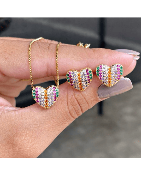 Conjunto Delicado de Colar e Brinco em Formato de Corações Cravejados em Zircônias Colors